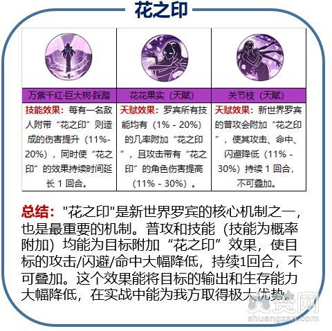 为了增加新世界罗宾释放技能时添加花之印效果的概率,可以选择首回合释放2主动+7费终结。毕竟花之印是新世界罗宾的主要机制,如果成功为目标添加了该效果,会使对方的输出和生存能力大幅降低,在实战中能为我方提供非常巨大的优势。还能打乱敌方阵型,非常具有战略意义。第二回合接奥义进行输出并延长状态时间,这种打法也是比较推荐的。