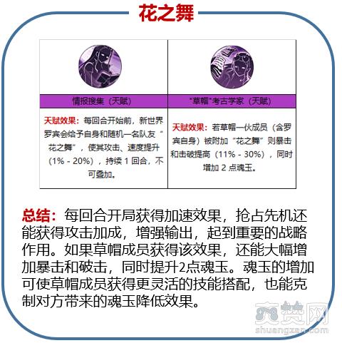 随着罗宾酱的到来,草帽一伙的队伍再次壮大了,从新世界罗宾的技能及核心机制来看,她在团队中的作用至关重要。作为一个肉度极高的辅助,她的“花之印”一定程度上来说能够克制目前的闪避流,另外,“花之舞”和“花之网”的效果使得高速团队(如草帽三人组)更加得心应手,发挥其真正的威力。相对来说新世界罗宾的辅助状态比如开局加速对于一些慢速角色作用就不那么大了,不过对于草帽一伙成员却是如虎添翼!!