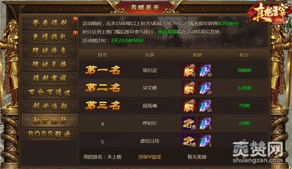 激情打boss,疯狂掉红装!在活动期间BOSS复活时间减半(跨服BOSS除外),活动期间击杀创世神达到指定只数即可领取丰厚奖励!击杀1500级以上的boss和转生boss获得积分,活动结束后更加排行邮件发送奖励!