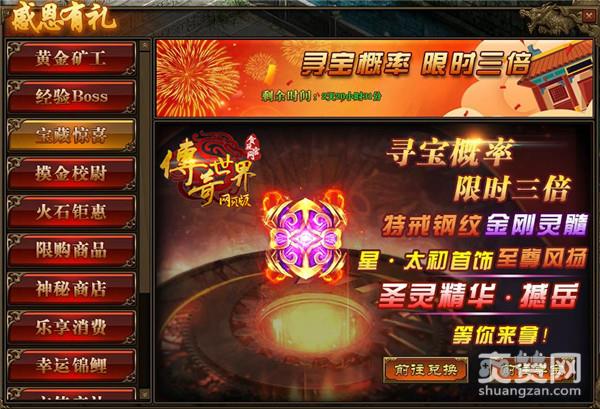 活动期间,玩家寻宝概率翻倍,极高几率获得星·太初首饰,传世灵器、传世灵甲,特戒钢纹,仙元石、碧落星空,传世灵器、传世灵甲,金刚灵髓、《传奇世界网页版》金刚精华,至尊风扬阵法以及圣灵精华(撼岳)!