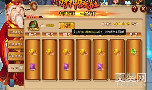 图上金晃晃的元宝不用看,那玩意是哄小孩不哭的。萝卜玩《神仙道》财神钱庄活动共分为甲乙丙丁四个档次,分别为10000元宝,5000元宝,1000元宝和100元宝。玩家购买招财神符之后,分七日返还丰富奖励。购买必须消耗当日充值元宝,每个玩家只能购买四种招财神符中的一个。在这里小编还要提醒大家,只有Vip3以上的玩家才能购买招财神符哦!