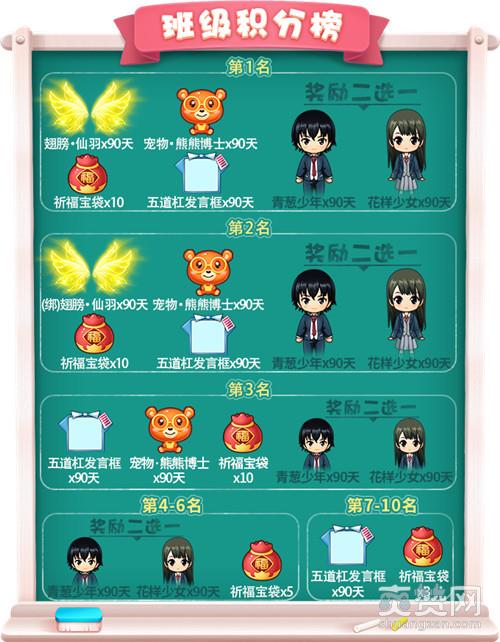 活动结束后,根据每个班级的游戏积分增长情况进行排名,为排名第一的班级中至少增长100游戏积分的玩家颁发奖励!