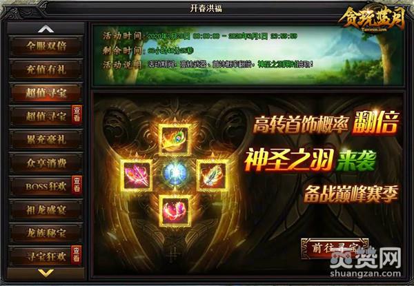 这次寻宝奖池里,神圣之羽和圣纹精魄强势袭来!活动期间,高转武器、首饰概率翻倍,寻宝次数达指定次数,即可领取额外大礼!快来和郭富城一起寻宝吧!