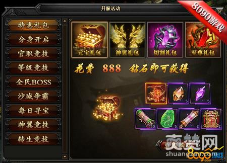 开服活动必不可少的特惠礼包,其中包括元宝礼包、神翼礼包、切割礼包、至尊礼包。还有全民boss,击杀对应BOSS可获得中级装备、元宝箱、魂珠碎片、宝石碎片等一系列稀有道具。