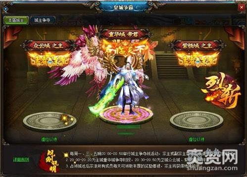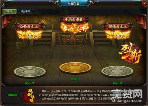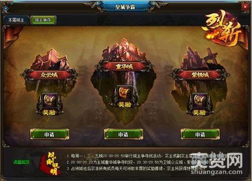 玩家如果想参加皇城争霸活动,那么在活动开始前,需要由宗主或副宗主申请攻打城池,每次最多申请一个,申请后10分钟内不得更改申请。每个宗派最多占领一个城池,主城争夺失败的宗派可继续申请争夺卫城,活动将与邻近服务器跨服进行,在本服宗派战力榜排名前三的宗派可成功申请进行城池争夺。