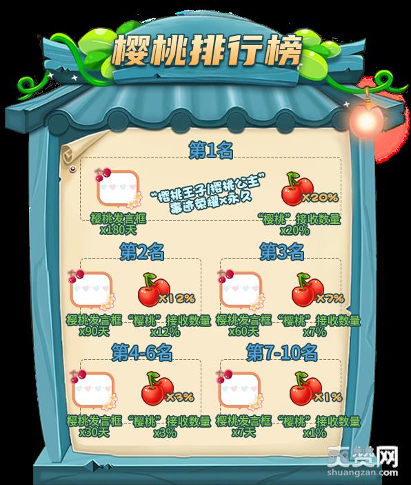 1. 成为“樱桃排行榜”前十名玩家,可获得您在活动期间接收的非绑定“樱桃”数量的百分比奖励(向下取整),奖励为非绑定“樱桃”;