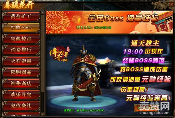 活动期间,每天19:00将在BOSS秘境中刷新BOSS,玩家可前往进行挑战,对BOSS造成的伤害,将在活动结束后转换成元神经验并发放!还可以可使用攻击药水,暴击药水的药品来获得更高的伤害,更多的经验哦~