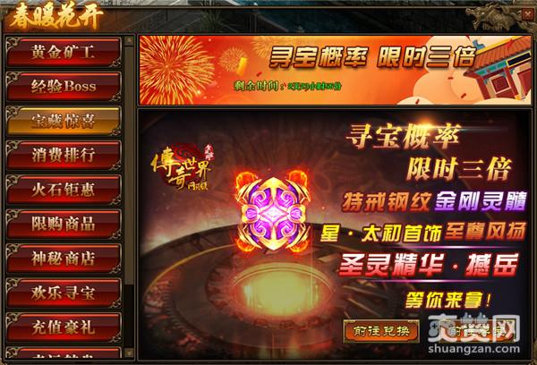 活动期间,玩家寻宝概率翻倍,极高几率获得星·太初首饰,传世灵器、传世灵甲,特戒钢纹,仙元石、碧落星空,传世灵器、传世灵甲,金刚灵髓、金刚精华,至尊风扬阵法以及圣灵精华(撼岳)!