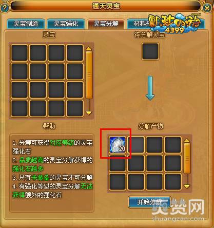 灵宝未装备时可对灵宝分解操作,灵宝分解原灵宝会消失。分解可获得对应等级的灵宝强化石。品质越高的灵宝分解获得的强化石越多。有强化等级的灵宝分解与无强化等级的灵宝分解所获得的强化石相同。
