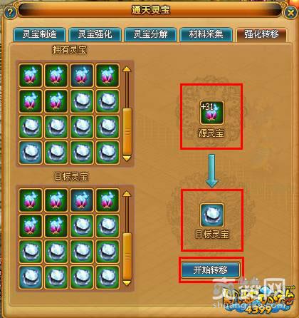 高等级灵宝可向低等级灵宝进行强化转移,转移完成后,源灵宝会消失,目标灵宝可获得源灵宝的强化等级。