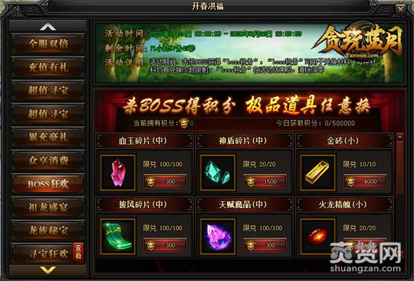 活动期间内,击杀BOSS获得“boss积分”,“boss积分”可用于兑换材料,每种材料均有兑换次数限制,“boss积分”在活动结束后清除归零。