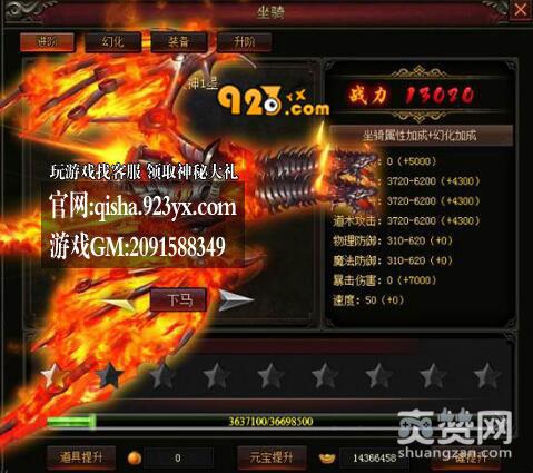 通过点击923yx《七杀》主界面左下方的坐骑图标,即可打开坐骑界面。坐骑可使用坐骑培养丹进行培养,也可以直接使用元宝进行提升和一键提升,一键提升等同于一次使用50次元宝提升,坐骑阶数越高,属性越强。