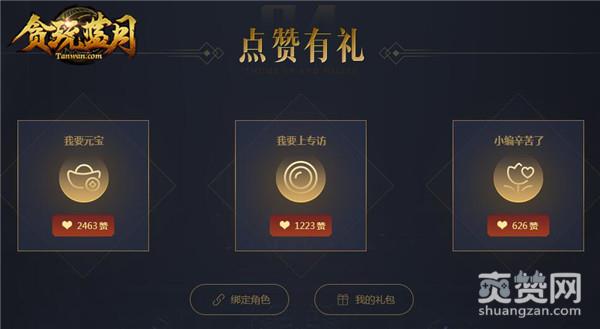 每位玩家登录绑定角色之后,都会获得1次点赞的机会!可自由选择三个点赞按钮中的一个,都会有几率获得大礼包一份,还有几率被抽中8888元宝奖励~