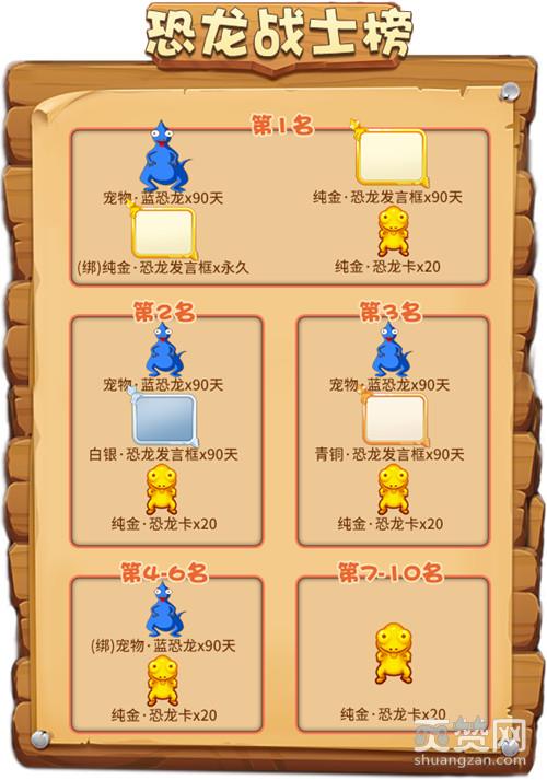 活动结束后,累计接收非绑定“恐龙卡”最多的前十位玩家,将成为“最强恐龙战士”,获得排行榜奖励!