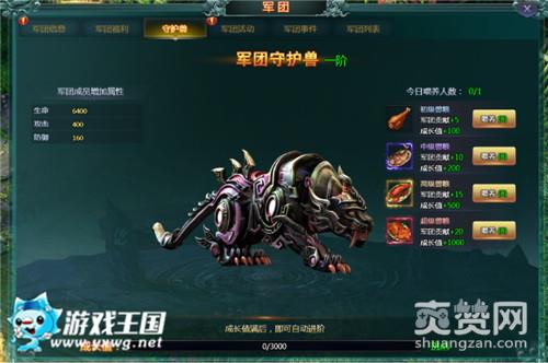 守护兽 玩家在击败BOSS时有几率获取兽粮,兽粮可以用于喂养军团守护兽,喂养后玩家可获得军团贡献,守护兽可获得成长值,成长值用于进阶守护兽。 守护兽等级提升后,军团所有成员可以获得属性加成,同时还能解锁挑战神兽;守护兽等级越高,军团所有成员属性加成更高。