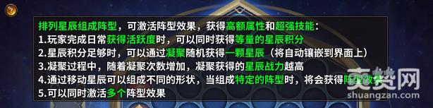 1、通过完成日常获得活跃度,可以同时获得等量的星辰积分。星辰积分达到一定数量时,可以通过凝聚随机获得一颗星辰,凝聚的星辰将自动镶嵌到【万罗星阵】上。随着凝聚次数增加,凝聚获得的星辰战力也会越高;