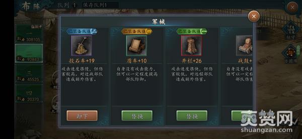 盾车这种辅助型军械,虽然没有攻击能力,不过能够提升部队的防御能力,在加以改造后还能使武将也获得防御提升、伤害减免的效果,甚至还能让前排武将反弹一定的伤害,回敬给对手!虽然没有攻击手段,但是由于这是个毫无缺陷的全队BUFF,所以也不会出现攻击落空、杀不死敌军等尴尬场面,非常适合纯输出的脆皮阵容使用。