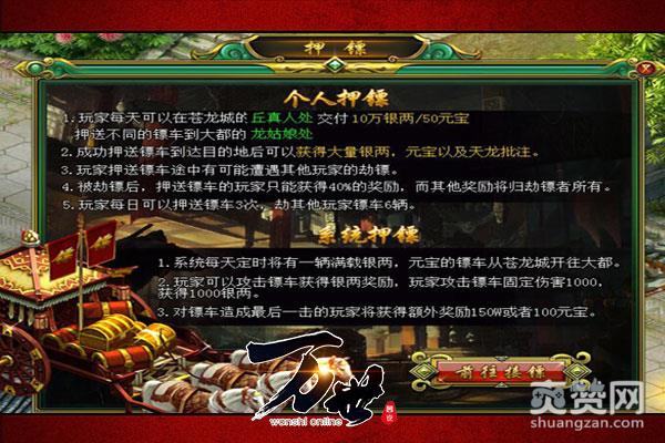 想要获得人人艳羡的身家,我们必须要靠通过双手的打拼,如此才能成就自我和财富。在大黑《万世》中,你可以根据自己的需求到天龙城的丘真人处接取镖车,只要能将镖车安全护送至龙姑娘处,你就可获得丰厚的奖励。一路上会有许多人觊觎镖车,因此你必须严守左右,务必保证镖车能够平安抵达。