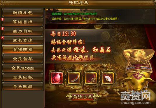 开服前7日,每日15:30分在指定位置会刷出一只送宝金猪,击杀后必爆橙装、红晶石等。