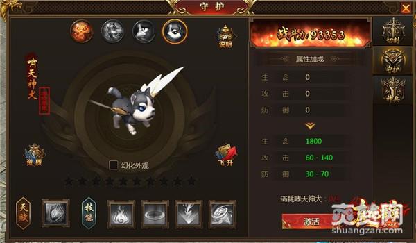 激活啸天神犬守护需要在跨服战场BOSS有一定几率爆出完整啸天神犬精魄,它的天赋技能效果:就是10%概率使自身受到伤害降低6%,持续三秒。这是对自身的防御和抗打能力提升是最好的帮助,当然每升一阶也是降低6%的自身受到伤害。他的其他属性加成跟其他守护也是一样的不变。而且所有天赋激活后可同时生效,同时触发天赋技能。