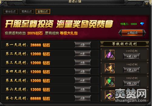 聚玩网页游戏烈斩投资计划比很多的页游都比较划算,玩家花费钻石进行投资,不仅可以获得钻石双倍返还,还可以获得额外等级返利道具装备等等。