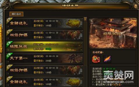 43u《炎黄大陆》中的极限挑战活动在14:00、22:00点开启,每次入口只开放10分钟。等级达到200级的勇士可以通过圣妖城NPC(143,46)打开界面,进入活动。活动中,只有收集足够的令牌方能进入下一层,最后层有几率爆出终极装备!