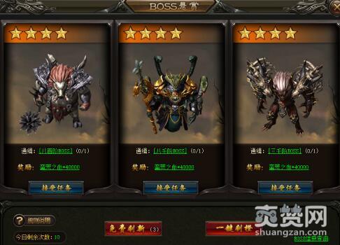 完成BOSS悬赏,拿丰厚奖励!当大家等级达到200级之后,即可在土城左方的敏峰处接取BOSS悬赏,每天可以完成10次任务。大家可以通过刷新任务获得高星级的悬赏,击杀BOSS即可获得包含蛮荒之血的奖励哦!