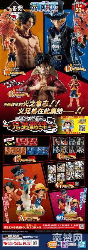 一番赏共有8种奖品,最终赏、A赏、B赏、C赏、D赏都是精美手办,E赏、F赏、G赏则是记事本、彩色玻璃碟、名言彩画等实用又精美的周边。本次《航海王:燃烧意志》与“一番赏 航海王~兄弟羁绊~”联动的系列周边包括路飞、艾斯、萨波三兄弟精美手办,能获取心仪的《航海王》限定周边,这样的机会你不想来参与一下吗?