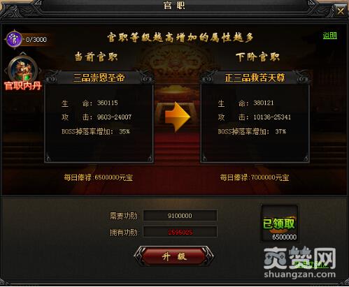 1.提升官职可获得相应属性,每日领取元宝奖励。