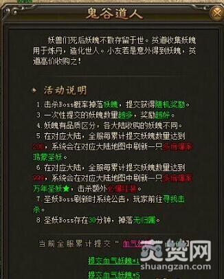 提交妖魄给对应大陆的鬼谷道人会获得鬼谷道人奖励的礼包,越高层所获得的礼包数量越多,大家开启礼包可获得各种随机奖励。.鬼谷道人每收集齐200枚妖魄,会引来一只高倍掉率圣妖Boss,圣妖Boss会随机刷在鬼谷道人所在大陆的等级地图中。