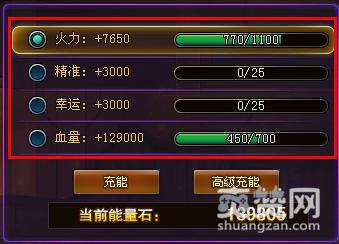 选定其中一种属性后,可点击充能或高级充能来进行升级,能量槽满了,属性就会升一级,属性值会增加。充能需要消耗一定数量的“能量石”,当“能量石”不足的时候可以使用点券。
