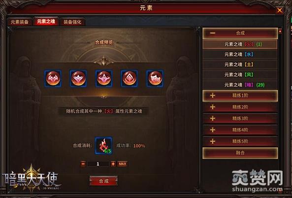 元素之魂有火、水、土、风、暗五种,它们通过元素之魂碎片合成而来,每一颗元素之魂都可以为玩家带来属性加成。同时,每种元素之魂分为五阶,玩家可以消耗元素符文等材料,对元素之魂进行精炼,若精炼成功,将提升精炼等级和精炼属性效果。若精炼失败,可能会使精炼等级下降。而使用祝福材料可以提升精炼成功率,来避免等级下降;在元素之魂精炼等级+7后,可消耗相同类型、等阶、精炼的元素之魂进行融合,成功后元素之魂等阶提升,随机生成一条新精炼属性。
