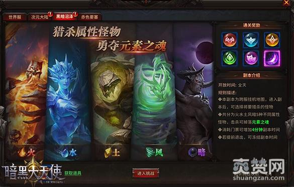 在玩家3角色达到380级后,玩家可以进入世界跨服地图—黑暗沼泽,每个玩家在副本的时间有限,但可凭借门票增加副本时间,若提前退出可冻结副本时间。玩家在副本中通过击杀不同的元素之灵,可以获得元素之魂以及碎片等材料。