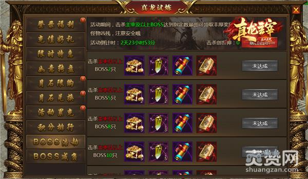 BOSS复活时间减半(跨服BOSS除外)。击杀1500级以上的boss、转生boss可加积分。获得积分排名后更有额外奖励~不止于此,活动期间击杀创世神达到指定数量,即可领取丰厚奖励