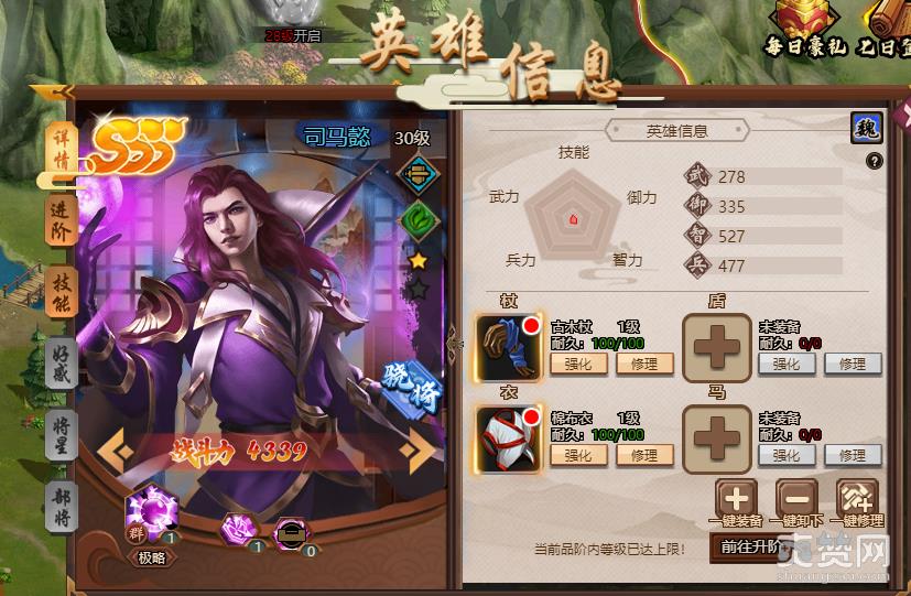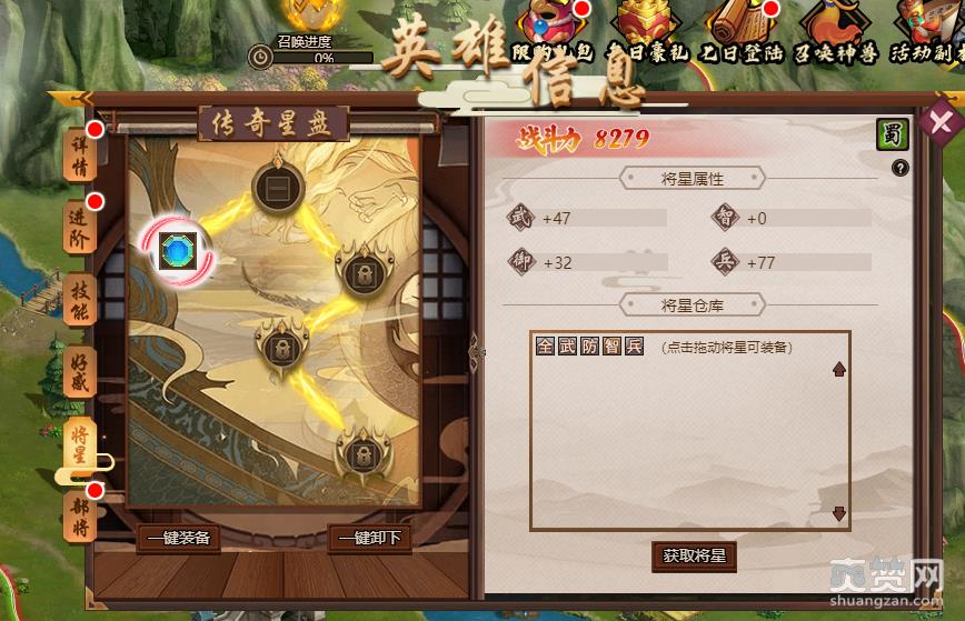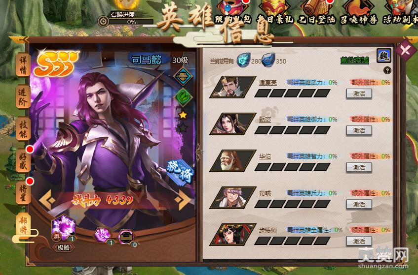 进阶是英雄养成的重要方式之一,英雄品阶分为偏将、良将、骁将、虎将、神将、天将这几种,玩家可以通过进阶升级英雄的品阶。进阶则需要消耗进阶材料,金币与英雄碎片。其中进阶不仅能提升英雄的战斗力,还可以提升英雄的等级上限,是升级英雄必不可少的环节。进阶材料,将魂,金币,英雄碎片都可以通过副本与各类活动中获取。