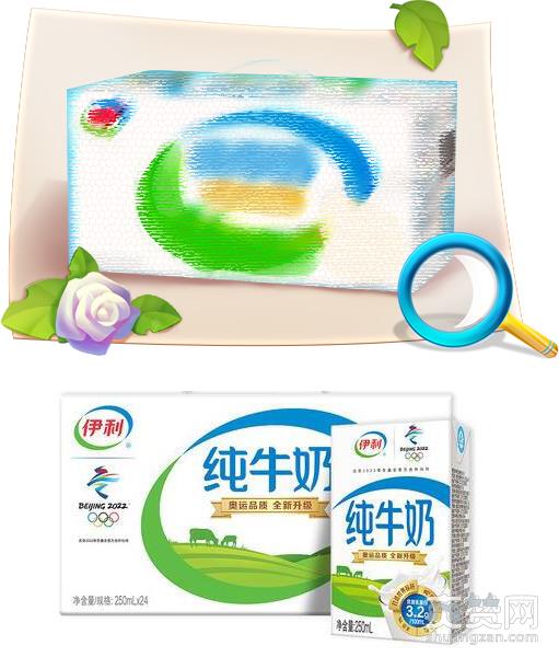 解析步骤(1):这张经过模糊处理的图片非常像小时候喝过的某种饮品——没错,伊利纯牛奶。在网上可以找到高清大图与之对比,发现它们的相似度非常高,所以几乎可以确定这张模糊图片就是想表达“伊利纯牛奶”的意图。