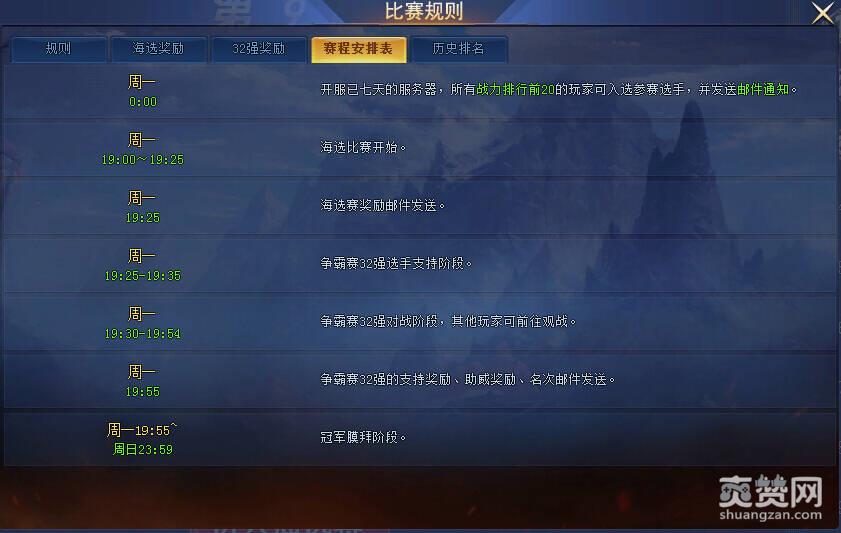 6.在周一海选19:25结束时通过邮件结算奖励,前32名进入争霸赛。