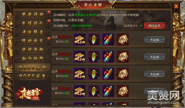 BOSS复活时间减半(跨服BOSS除外)。击杀1500级以上的boss、转生boss可加积分。获得积分排名后更有额外奖励~不止于此,活动期间击杀创世神达到指定数量,即可领取丰厚奖励。