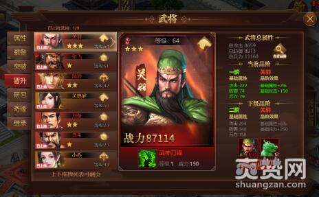 随着主公的成长,主公手下的武将也可以升迁。晋升系统可以提升武将的阶位,使武将战力和属性得到大幅提升,并且还有额外的特殊属性可以解锁。武将晋升一共分为15个等阶,所有武将默认都是“零阶”需要花费对应武将的武魂才能晋升。