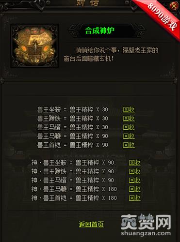 当然多余的兽王坐骑装备也可以去合成神炉分解成精粹,普通兽王装备分解回收可以获得30个精粹,马鞭跟首铠可90个,神级兽王普通装备回收90个精粹,神级马鞭,首铠回收180个精粹