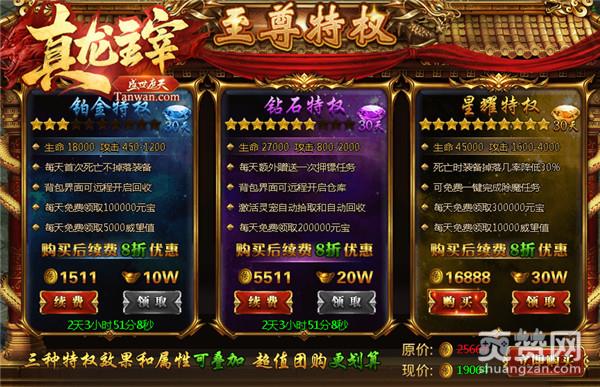 铂金特权效果:角色每天首次死亡不掉落装备,且背包界面可远程开启回收,另外每天还可以免费领取10W元宝和5000威望。
