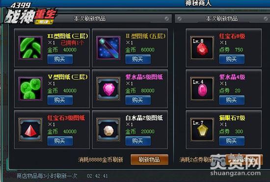 神秘商人里的物品道具都是随机出现的,主要是宝石、宝石图纸以及基因图纸。由于基因层数太多,所以每次神秘商人每次刷新的时候都不一定能够保证会出现自己所需要的基因图纸。在神秘商人商店界面下方,有金币刷新的选项,消耗88888金币就可以刷新一次。如果不适用这个功能,就要等3个小时才会自动刷新。