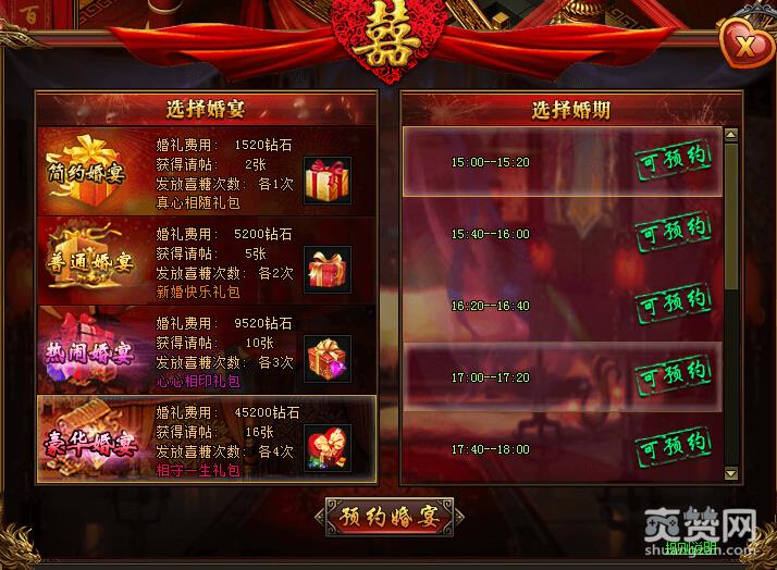 2、预约婚宴:求婚成功后,可通过到月老处进行婚宴预约,婚宴等级不同赠送价值不同的礼包。已预约婚宴并未成功办理的,不可以申请离婚