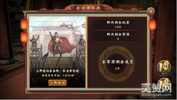 “长安争夺战”每次持续20分钟,玩家可以在活动开启前10分钟迁入长安郡,活动开启后,长安郡内所有玩家都会获得参与资格,长安郡之外的玩家将无法再迁入;在这场争夺战中,玩家没有任何方式恢复主城的繁荣度,一旦繁荣变为0,就会被随机迁出长安郡;最后只有仅剩的一个军团能够胜出并获得长安的占领权,并获得长安的城池科技和增益以及每日占领奖励。
