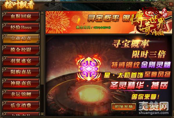 而端午佳节,少不了我们的宝藏惊喜!在活动期间,玩家寻宝概率翻倍,有极高几率获得星·太初首饰,碧落星空,传世灵器、传世灵甲,金刚灵髓、金刚精华,至尊风扬阵法以及圣灵精华(撼岳),还有各种超豪华奖励等你拿!