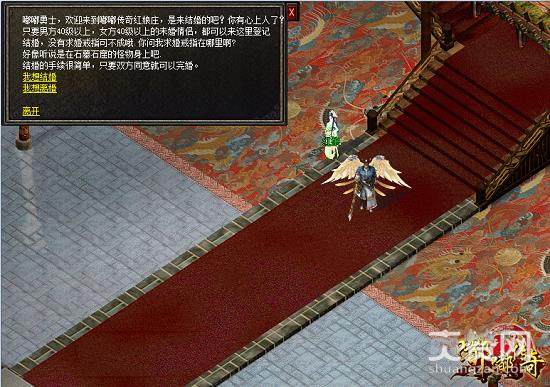 买完戒指之后,两个人再去月老那里进行求婚仪式,记住月老在比奇省的姻缘神殿里。到达目的地之后,男玩家用三生定情戒向女玩家进行求婚,只要女玩家接受了求婚,那么系统就会判定双方结为夫妻。