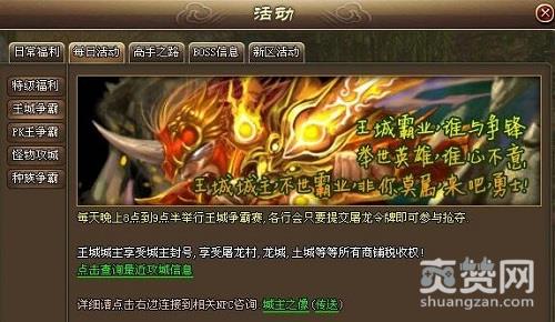 923yx《屠龙传说》中的王城争霸属于团体PK,需要行会申请报名,之后在晚上20:00开启,经过两个小时的角逐评出王者!在王城争霸活动中,大家需要占领皇宫,只有当皇宫里只剩自己行会的人时方可胜利。