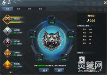 兽灵开启需要特定装备,而且想要激活兽灵必须全部穿戴装备才可以激活,之后点击“ 助战”即可出战!由上而下兽灵的属性逐渐增加,同时开启所需的装备品级也会增加。 页面下方有不同兽灵的技能,可以先行预览。