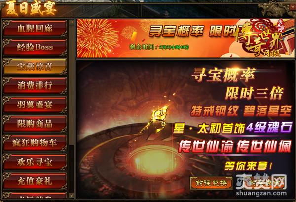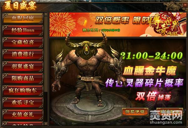 活动期间,玩家可进入“多人副本-血腥回廊”,击败BOSS血腥金牛魔,即可获得“传世灵器碎片”,而且掉落的概率翻倍,助你早日拿到传世灵器!