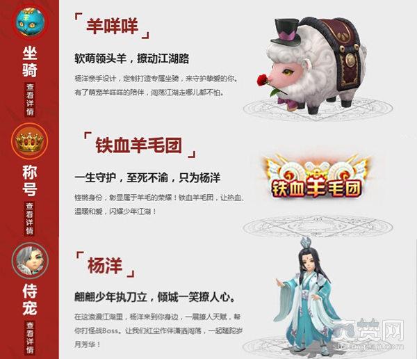 一生守护,至死不渝,37《少年群侠传》打造“铁血羊毛团”专属称号,铿锵身份,彰显属于羊毛的荣耀和温暖;还有由杨洋亲手设计的“羊咩咩”专属坐骑,可谓“软萌领头羊,撩动江湖路”。另外,在37《少年群侠传》的浪漫江湖中,杨洋也会化身侍宠“杨洋”,一战撩妹天赋,帮你打怪战BOSS,倾城一笑走天涯。